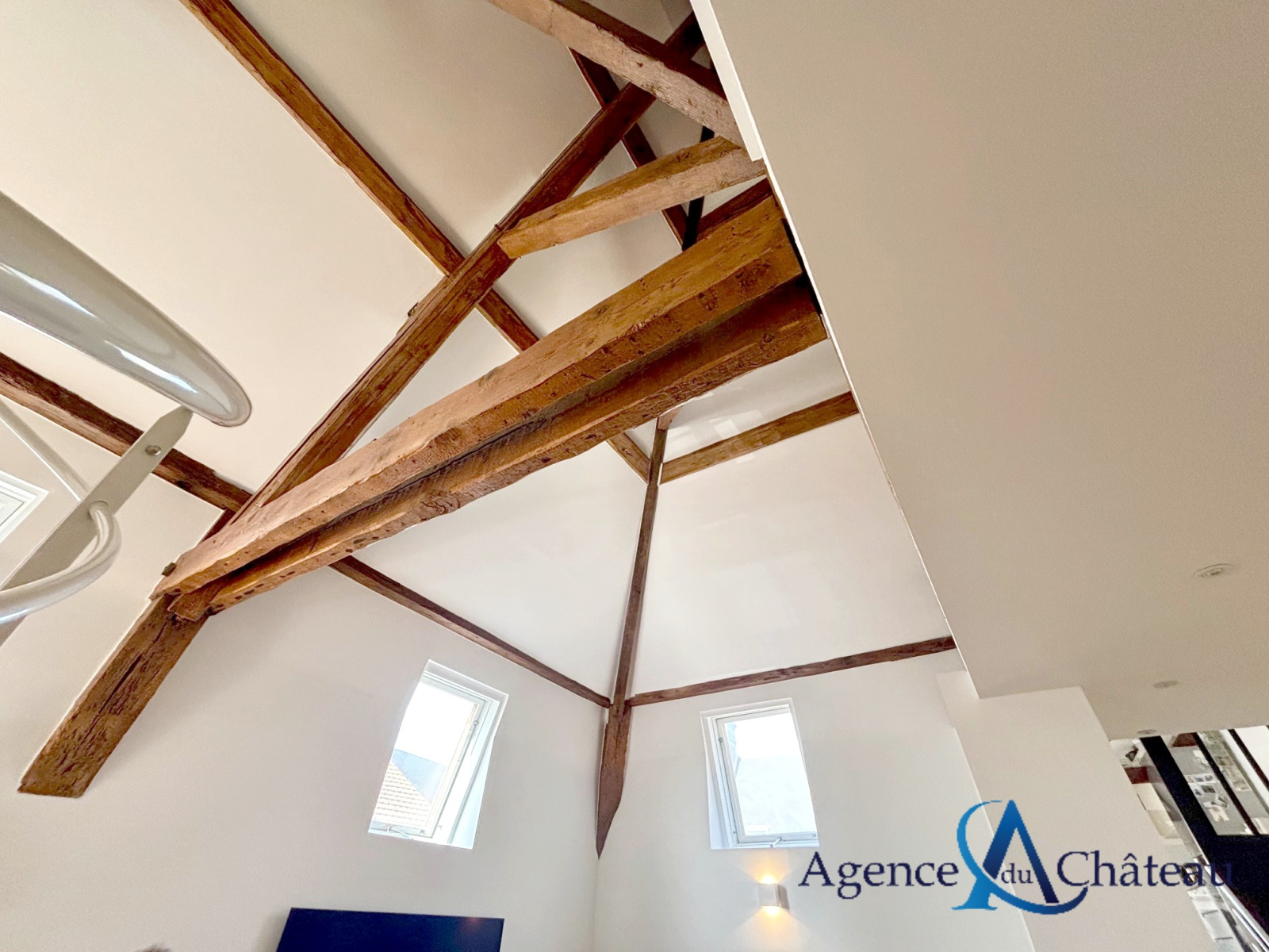 au 2ème étage : un palier, une cuisine équipée, un très beau séjour / salle à manger avec toit cathédrale et poutres apparentes, une mezzanine couchage surplombant le séjour.