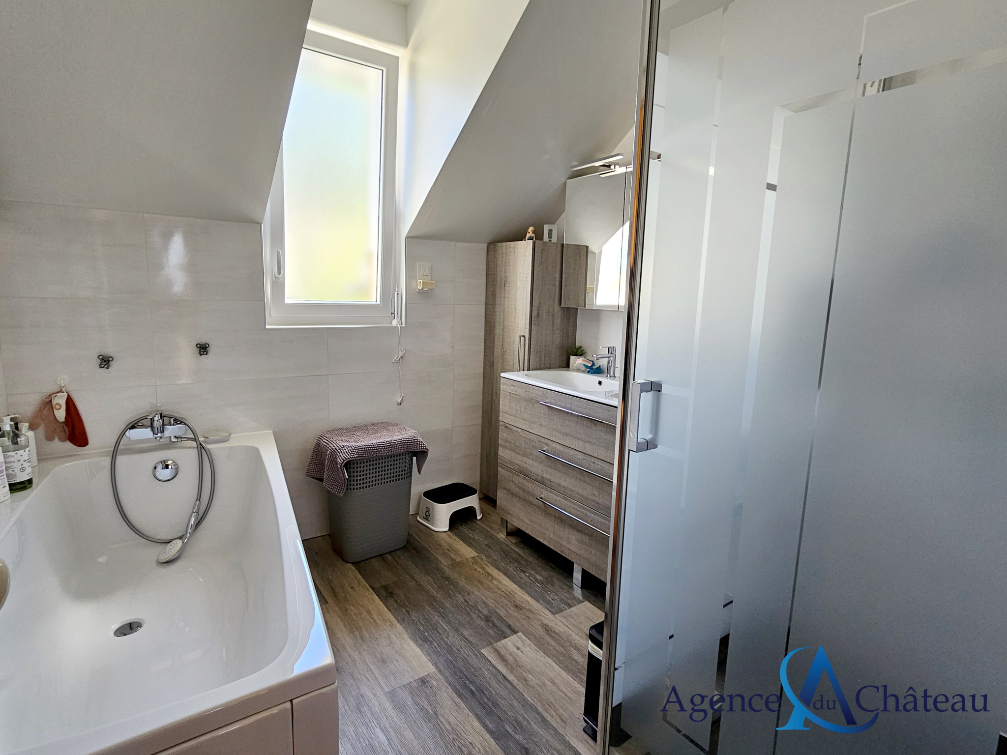 A l 'étage : un palier, trois chambres, une salle de bains équipée avec douche, un wc.